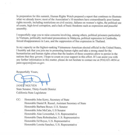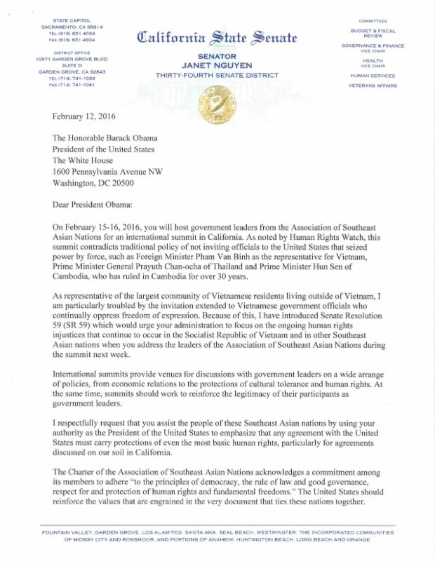 (Sacramento, CA) Today, Senator Janet Nguyen sent a letter to President Barack Obama requesting that he discuss ongoing human rights abuses in Southeast Asia when he convenes a summit with government leaders from the Association of Southeast Asian Nations. In addition to the letter, Senator Nguyen introduced Senate Joint Resolution 59, which formally calls on the President to introduce this critical topic as part of the summit's agenda.